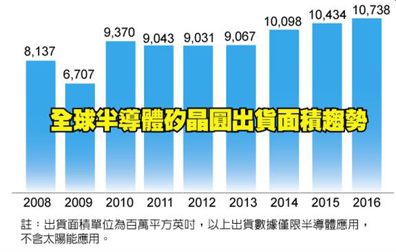 依據(jù)國(guó)際半導(dǎo)體產(chǎn)業(yè)協(xié)會(huì)(SEMI)旗下硅晶圓制造者部門SMG(Silicon Manufacturers Group)公布的年終硅晶圓產(chǎn)業(yè)分析報(bào)告顯示,2016年全球半導(dǎo)體硅晶圓出貨總面積達(dá)10,738百萬(wàn)平方英吋,年成長(zhǎng)率達(dá)3%,連續(xù)3年創(chuàng)下出貨量歷史記錄新高。