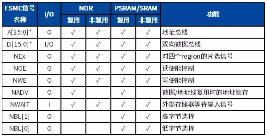 MM32F3270的FMSC外部接口信號(hào),可使用異步方式訪問(wèn)SRAM,可以選用復(fù)用或非復(fù)用方式擴(kuò)展SRAM,還可以通過(guò)配置實(shí)現(xiàn)外擴(kuò)8位總線或16位總線接口的SRAM。目前市場(chǎng)上非復(fù)用型16位數(shù)據(jù)總線接口的SRAM/PSRAM較為普遍。