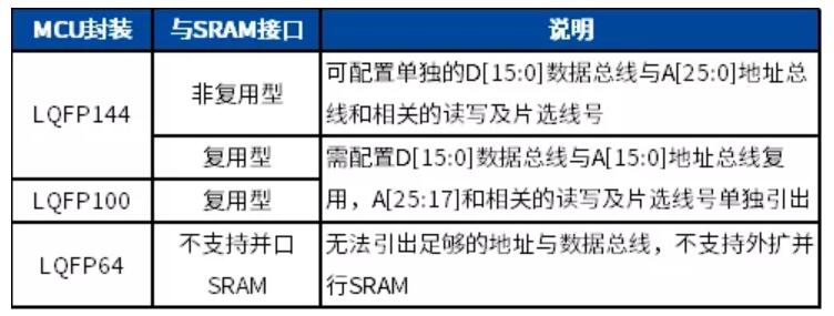 MM32F3270系列MCU因?yàn)榉庋b的原因,導(dǎo)致只有部分MCU產(chǎn)品可以通過(guò)硬件復(fù)用出全部或部分的FSMC接口的相關(guān)GPIO,才能支持外接SRAM存儲(chǔ)器擴(kuò)展存儲(chǔ)空間。其中LQFP144引腳封裝MCU芯片支持連接地址數(shù)據(jù)非復(fù)用和復(fù)用方式外擴(kuò)并行SRAM;而LQFP100引腳封裝芯片因地址線縮減,僅支持連接地址數(shù)據(jù)復(fù)用方式外擴(kuò)并行SRAM。LQFP64因?yàn)闊o(wú)法引出足夠的地址與數(shù)據(jù)總線,不支持外擴(kuò)并行SRAM。