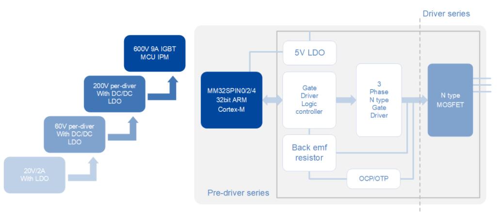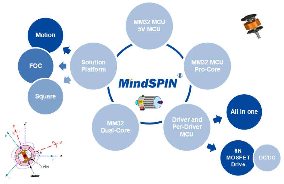 SPIN是旋轉(zhuǎn)的同義詞,再注入靈動(dòng)微電子的靈魂Mind,表示靈活與專業(yè)。包含了三大主軸:專業(yè)MCU,專用驅(qū)動(dòng)MCU微控制器及解決方案平臺(tái)。專用MCU的獨(dú)特之處是帶領(lǐng)了許多主流應(yīng)用,如:電動(dòng)車的應(yīng)用,目前市場(chǎng)的占有率仍然保持領(lǐng)先地位;專用驅(qū)動(dòng)型MCU微控制器電壓范圍從20V至600V。例:MM32SPIN222C集成了三相MOSFET、預(yù)驅(qū)以及LDO,可讓小空間發(fā)揮最大的功能,同時(shí)內(nèi)建了高性能32位的Arm Cortex-M0內(nèi)核為運(yùn)算核心,讓開發(fā)更為簡(jiǎn)單快捷;解決方案平臺(tái)由擁有超過10年以上算法開發(fā)經(jīng)驗(yàn)的MindSPIN團(tuán)隊(duì)精心打造,按技術(shù)方式分為方波、旋波FOC以及位置控制三類,按應(yīng)用方式可分為風(fēng)機(jī)、電動(dòng)工具、微電機(jī)、家電以及電動(dòng)車五大類,同時(shí)靈動(dòng)微電子還提供了不同的相對(duì)應(yīng)的特色