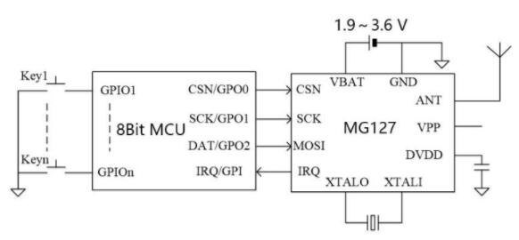 藍牙芯片MG127是具有低功耗、低成本的BLE 收發器,內部集成了發射機、接收機、GFSK 調制解調器和BLE 基帶處理。電源電壓1.9~3.6,可以采用一個紐扣電池(3.0v)供電,具備3uA待機電流,20mA@0dBm持續發射,18mA持續接收等特點。MG127 采用DFN3x3 封裝,只需搭配低成本MCU 和少數外圍被動器件,即可實現BLE 遙控、藍牙電子秤等應用。