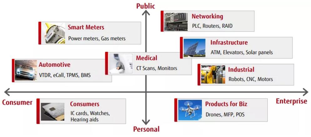 經(jīng)過市場的長期廣泛驗證以及技術(shù)的不斷突破,富士通FRAM產(chǎn)品已成功應(yīng)用于智能卡及IC卡等卡片領(lǐng)域、電力儀表及產(chǎn)業(yè)設(shè)備等工業(yè)領(lǐng)域,醫(yī)療設(shè)備及醫(yī)療RFID標(biāo)簽等醫(yī)療領(lǐng)域、胎壓監(jiān)測及新能源汽車電池管理系統(tǒng)等汽車領(lǐng)域等等,涉及的應(yīng)用超過200種,幾乎覆蓋所有主要領(lǐng)域!