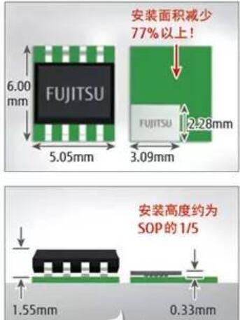 FRAM——MB85RS1MT,這是一款有8引腳晶圓級(jí)芯片尺寸封裝(WL-CSP)的產(chǎn)品,與傳統(tǒng)業(yè)界標(biāo)準(zhǔn)SOP封裝相比,此款WL-CSP大約為SOP的23%,能夠減少約77%的安裝面積。而且本W(wǎng)L-CSP的厚度為0.33mm,約是信用卡的一半,從安裝體積比來看,能夠減少大約95%的體積。 是