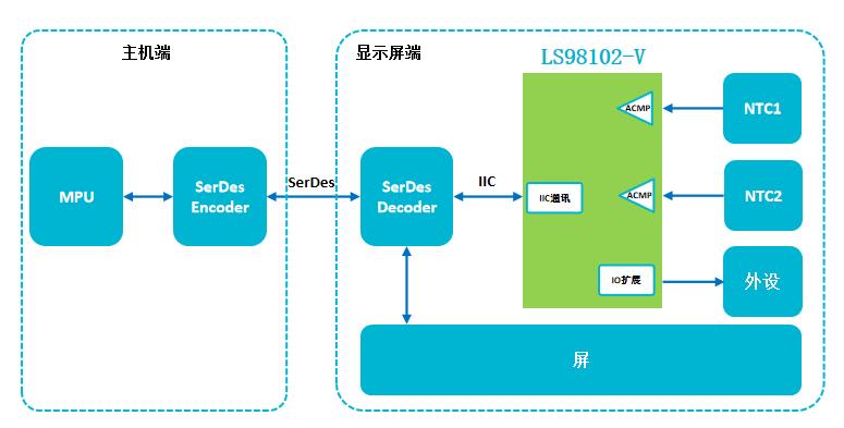現場可重構IC LS98102/-V采用QFN14封裝(車規級),供電范圍2.3V~5.5V,靜態電流100nA,12個可任意配置GPIO。該器件具有監控2路NTC的溫度,溫度異常時發出中斷給SerDes端,主機控制發出關屏等指令信息擴展GPIO口,用于控制顯示屏端其他外設。